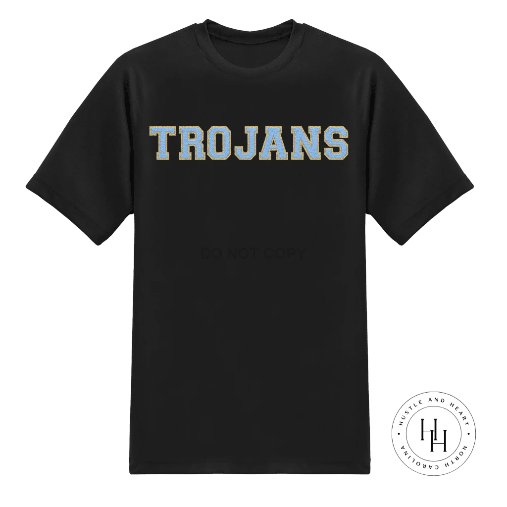 Brand new ๐Ÿ˜ Hustle And Heart NC Trojans Light Blue/Gold Faux Chenille Letters Graphic Tee Faux Chenille And Glitter Letter Patch Tees ๐Ÿงจ
