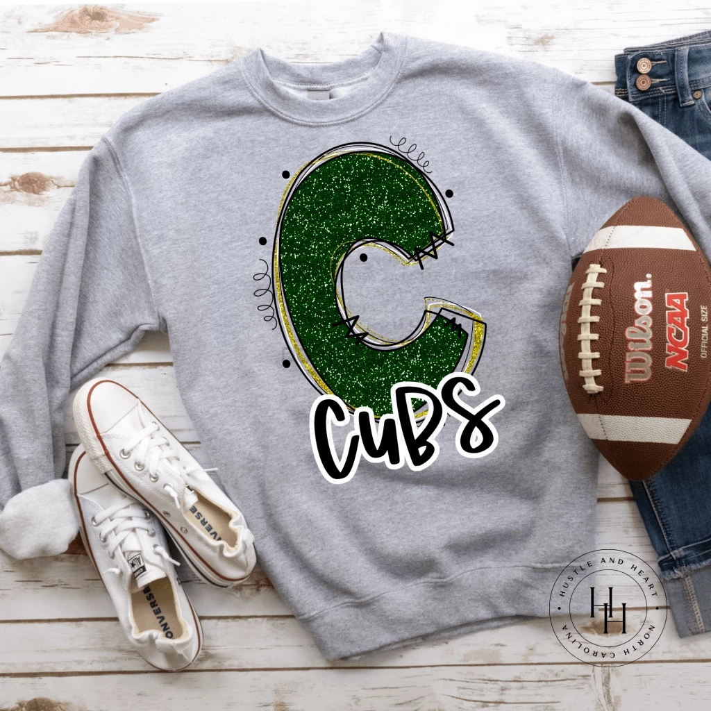 Discount ⌛ Hustle & Heart NC School Doodle Designs Cubs Dark Green/Yellow Glitter Varsity Doodle 🛒