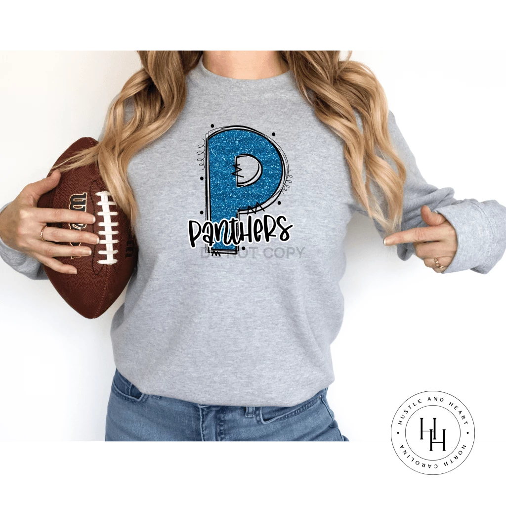 Best Sale ❤️ Hustle & Heart NC School Doodle Designs Panthers Blue Glitter Varsity Doodle 🎁